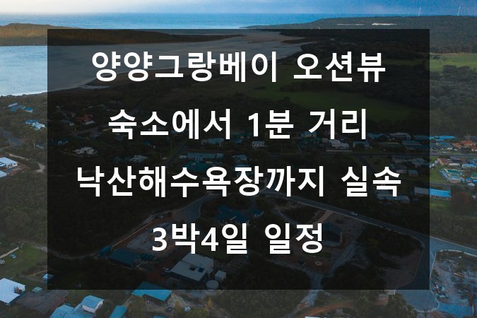 μ•ˆλ…•ν•˜μ„Έμš”! ν˜Ήμ‹œ λ°”λ‹€λ₯Ό 바라보며 νžλ§ν•  수 μžˆλŠ” μ—¬ν–‰μ§€ μ°Ύκ³  κ³„μ‹ κ°€μš”? πŸ€” 강원도 μ–‘μ–‘μ˜ λ‚™μ‚°ν•΄μˆ˜μš•μž₯ κ·Όμ²˜μ—μ„œ νŽΈμ•ˆν•œ μ˜€μ…˜λ·° μˆ™μ†Œλ₯Ό μ˜ˆμ•½ν•˜κ³ , μ•Œμ°¬ 3λ°•4일 일정을 μ¦κΈ°λŠ” 방법을 μ•Œλ €λ“œλ¦΄κ²Œμš”. νœ΄μ‹κ³Ό μ•‘ν‹°λΉ„ν‹°, λ§›μ§‘ νƒλ°©κΉŒμ§€ ν•œ λ²ˆμ— κ°€λŠ₯ν•œ μ½”μŠ€λΌλ©΄ 이 글이 λ”±μž…λ‹ˆλ‹€! 😎